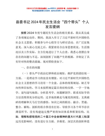 / 县委书记2024年民主生活会“四个带头”个人发言提纲