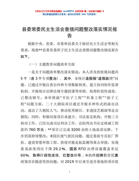 / 县委常委民主生活会查摆问题整改落实情况报告