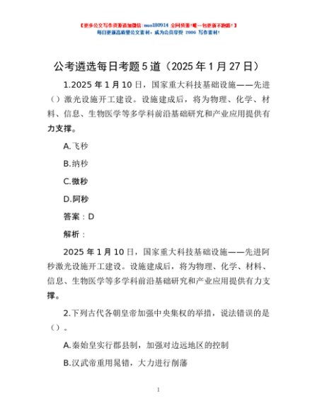 公考遴选每日考题5道(2025年1月27日)