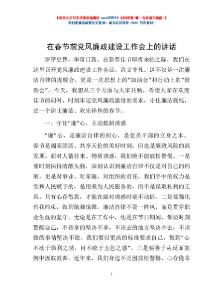 / 在春节前党风廉政建设工作会上的讲话