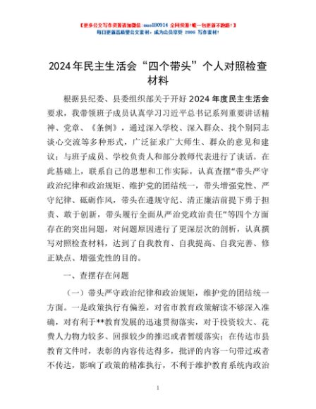 / 2024年民主生活会“四个带头”个人对照检查材料