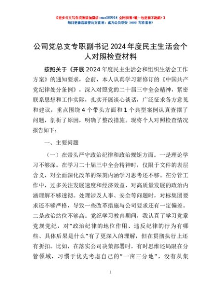/ 公司党总支专职副书记2024年度民主生活会个人对照检查材料