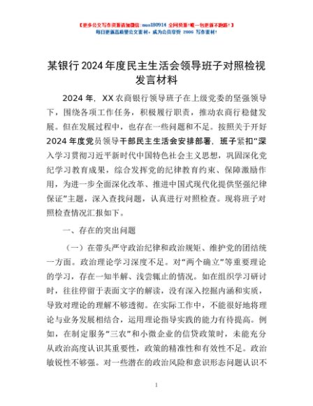 / 某银行2024年度民主生活会领导班子对照检视发言材料