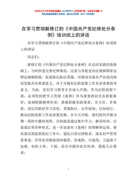 / 在学习贯彻新修订的《中国共产党纪律处分条例》培训班上的讲话