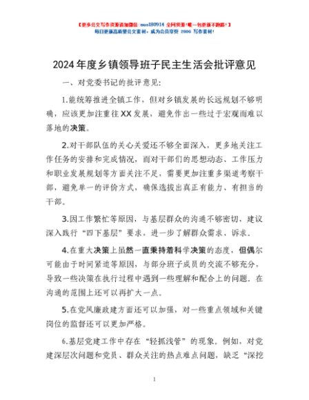 / 2024年度乡镇领导班子民主生活会批评意见