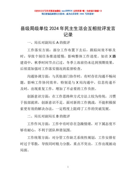 / 县级局级单位2024年民主生活会互相批评发言记录