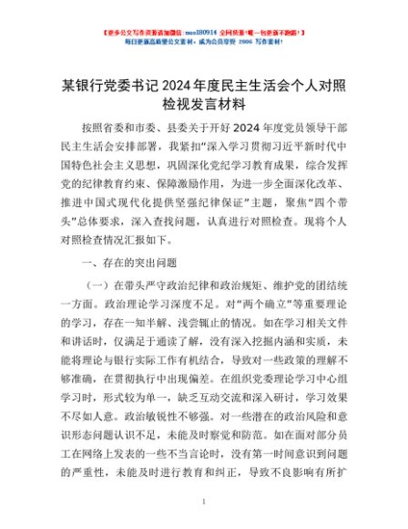 / 某银行党委书记2024年度民主生活会个人对照检视发言材料