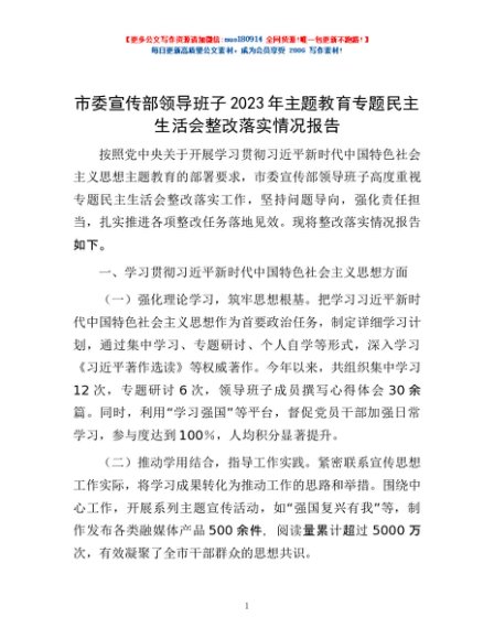 / 市委宣传部领导班子2023年主题教育专题民主生活会整改落实情况报告