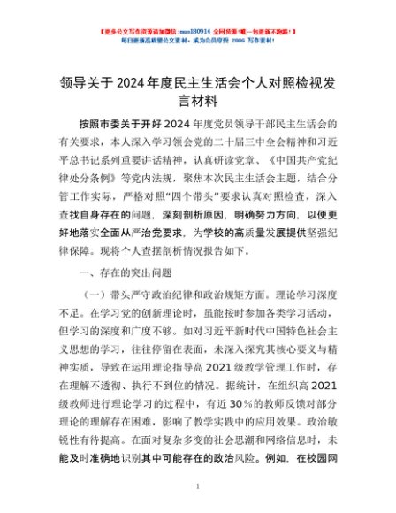 / 领导关于2024年度民主生活会个人对照检视发言材料