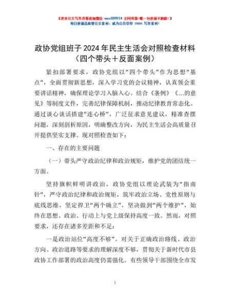 / 政协党组班子2024年民主生活会对照检查材料(四个带头+反面案例)