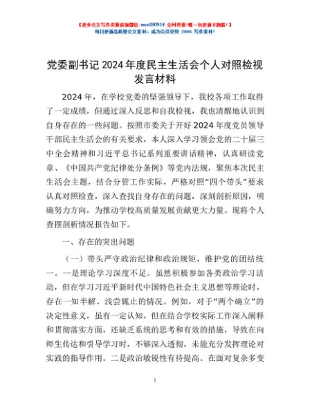 / 党委副书记2024年度民主生活会个人对照检视发言材料
