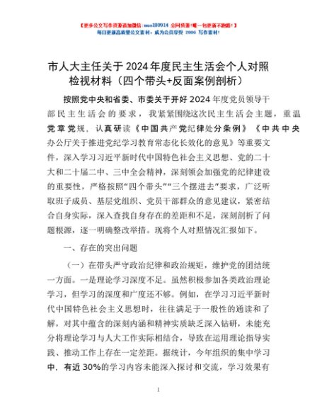/ 市人大主任关于2024年度民主生活会个人对照检视材料(四个带头+反面案例剖析)