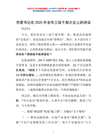 / 市委书记在2025年全市三级干部大会上的讲话