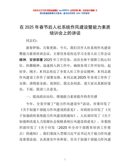 / 在2025年春节后人社系统作风建设暨能力素质培训会上的讲话