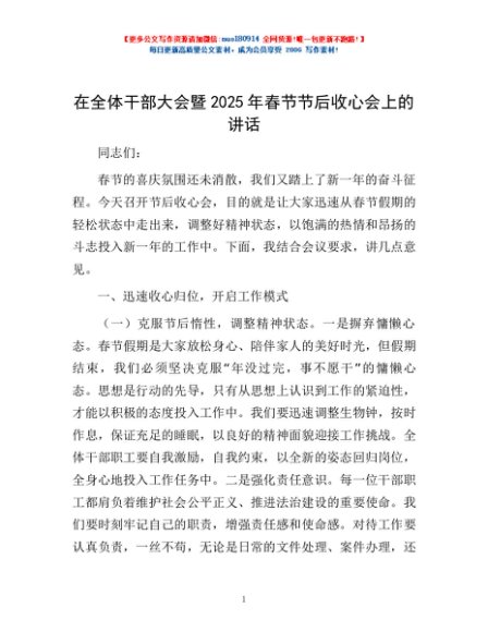 / 在全体干部大会暨2025年春节节后收心会上的讲话