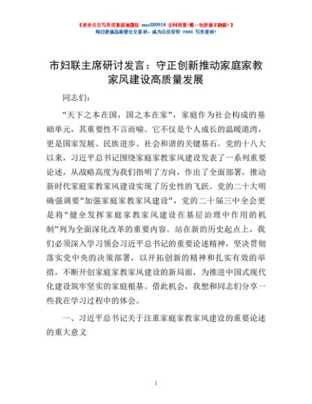 市妇联主席研讨发言:守正创新 推动家庭家教家风建设高质量发展