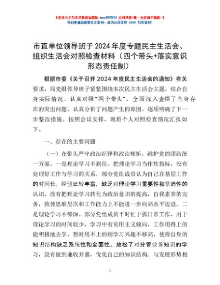 / 市直单位领导班子2024年度专题民主生活会、组织生活会对照检查材料(四个带头+落实意识形态责任制)