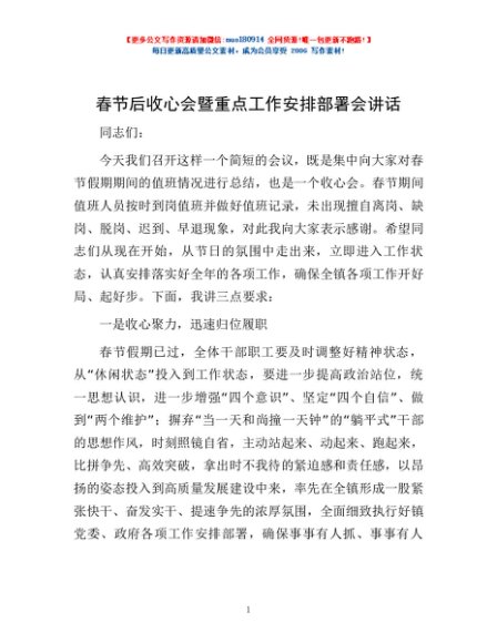 / 春节后收心会暨重点工作安排部署会讲话