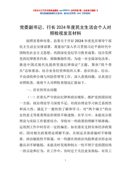 / 党委副书记、行长2024年度民主生活会个人对照检视发言材料