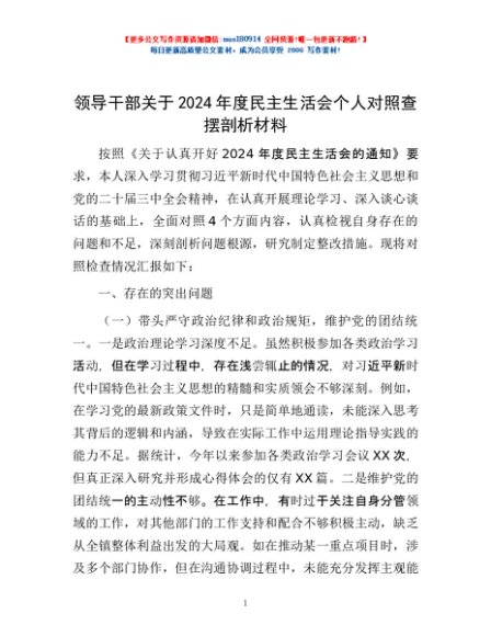 / 领导干部关于2024年度民主生活会个人对照查摆剖析材料