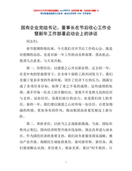 / 国有企业党组书记、董事长在节后收心工作会暨新年工作部署启动会上的讲话