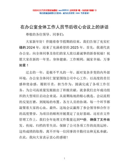 / 在办公室全体工作人员节后收心会议上的讲话