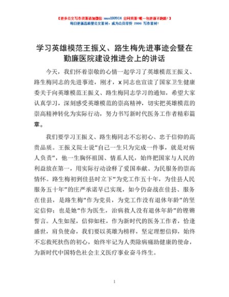 / 学习英雄模范王振义、路生梅先进事迹会暨在勤廉医院建设推进会上的讲话