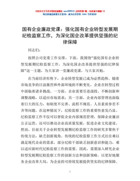 / 国有企业廉政党课:强化国有企业转型发展期纪检监察工作,为深化国企改革提供坚强的纪律保障