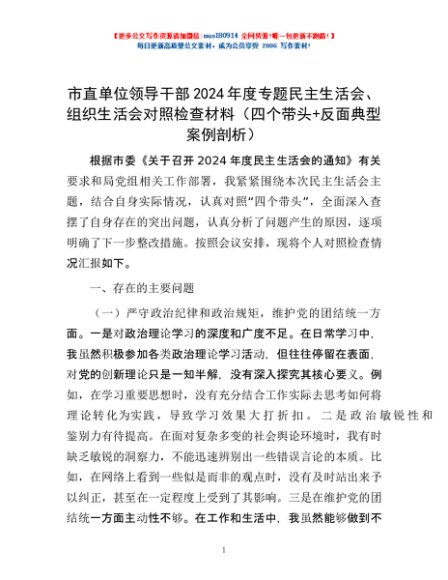 / 市直单位领导干部2024年度专题民主生活会、组织生活会对照检查材料(四个带头+反面典型案例剖析)