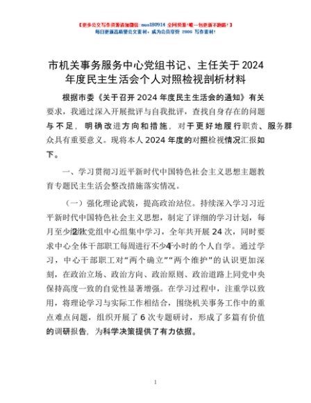 / 市机关事务服务中心党组书记、主任关于2024年度民主生活会个人对照检视剖析材料