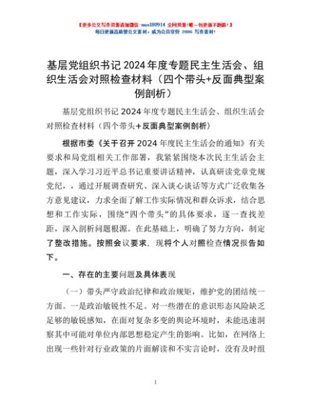 / 基层党组织书记2024年度专题民主生活会、组织生活会对照检查材料(四个带头+反面典型案例剖析)