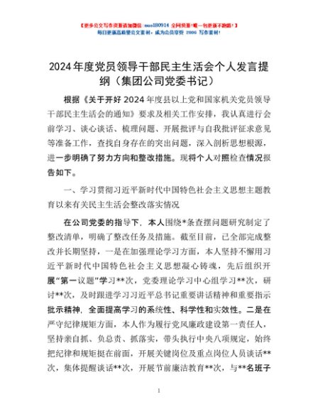 / 2024年度党员领导干部民主生活会个人发言提纲(集团公司党委书记)
