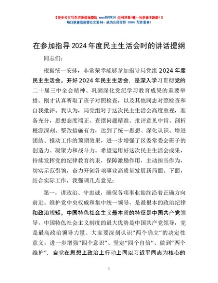 / 在参加指导2024年度民主生活会时的讲话提纲