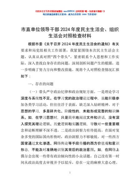 / 市直单位领导干部2024年度民主生活会、组织生活会对照检查材料