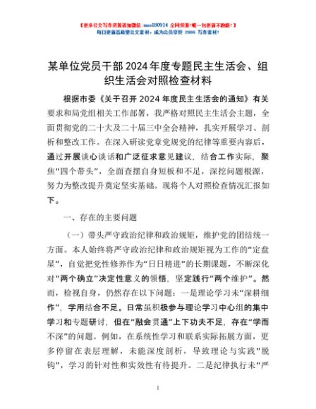 / 某单位党员干部2024年度专题民主生活会、组织生活会对照检查材料