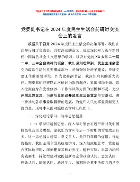 / 党委副书记在2024年度民主生活会前研讨交流会上的发言