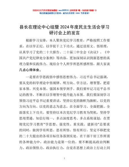 / 县长在理论中心组暨2024年度民主生活会学习研讨会上的发言