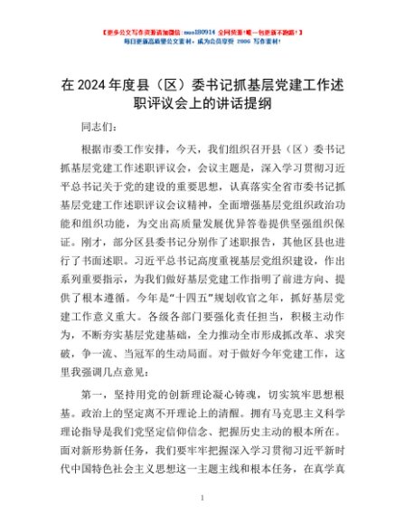 / 在2024年度县(区)委书记抓基层党建工作述职评议会上的讲话提纲