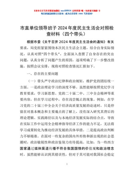 / 市直单位领导班子2024年度民主生活会对照检查材料(四个带头)