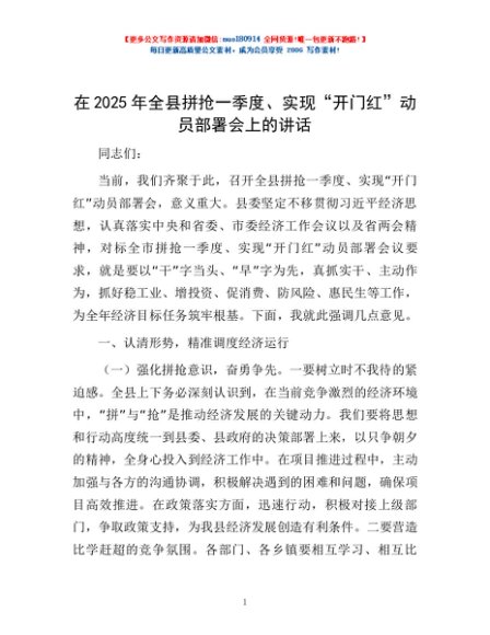 / 在2025年全县拼抢一季度、实现“开门红”动员部署会上的讲话