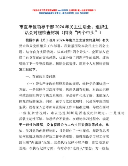 / 市直单位领导干部2024年民主生活会、组织生活会对照检查材料(围绕“四个带头”)