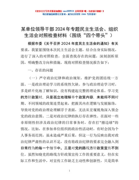 / 某单位领导干部2024年专题民主生活会、组织生活会对照检查材料(围绕“四个带头”)