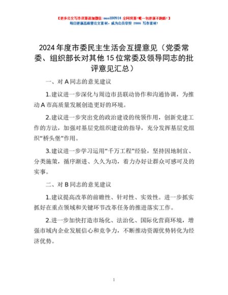 / 2024年度市委民主生活会互提意见(党委常委、组织部长对其他15位常委及领导同志的批评意见汇总)