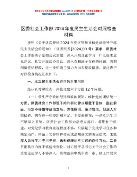 / 区委社会工作部2024年度民主生活会对照检查材料