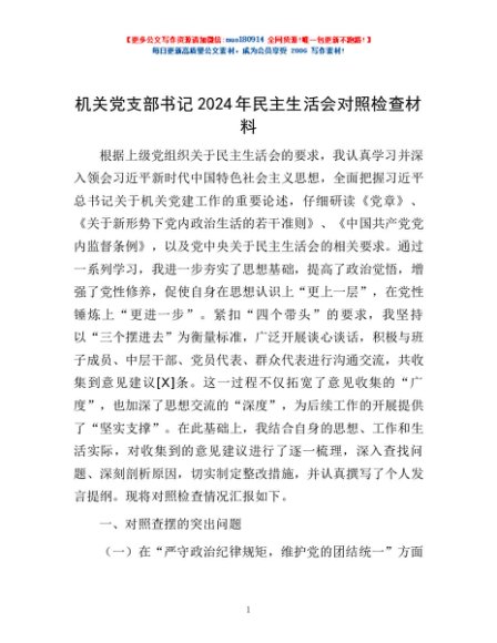 / 机关党支部书记2024年民主生活会对照检查材料