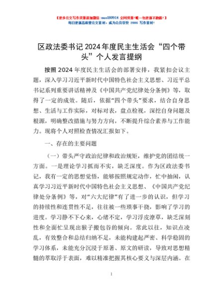/ 区政法委书记2024年度民主生活会“四个带头”个人发言提纲