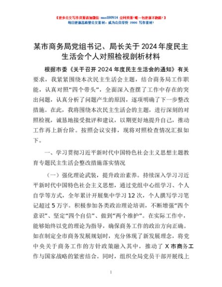 / 某市商务局党组书记、局长关于2024年度民主生活会个人对照检视剖析材料