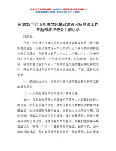 / 在2025年市直机关党风廉政建设和反腐败工作专题部署推进会上的讲话
