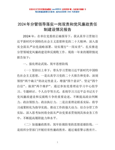 / 2024年分管领导落实一岗双责和党风廉政责任制建设情况报告