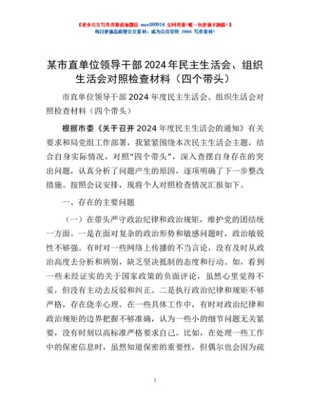/ 某市直单位领导干部2024年民主生活会、组织生活会对照检查材料(四个带头)